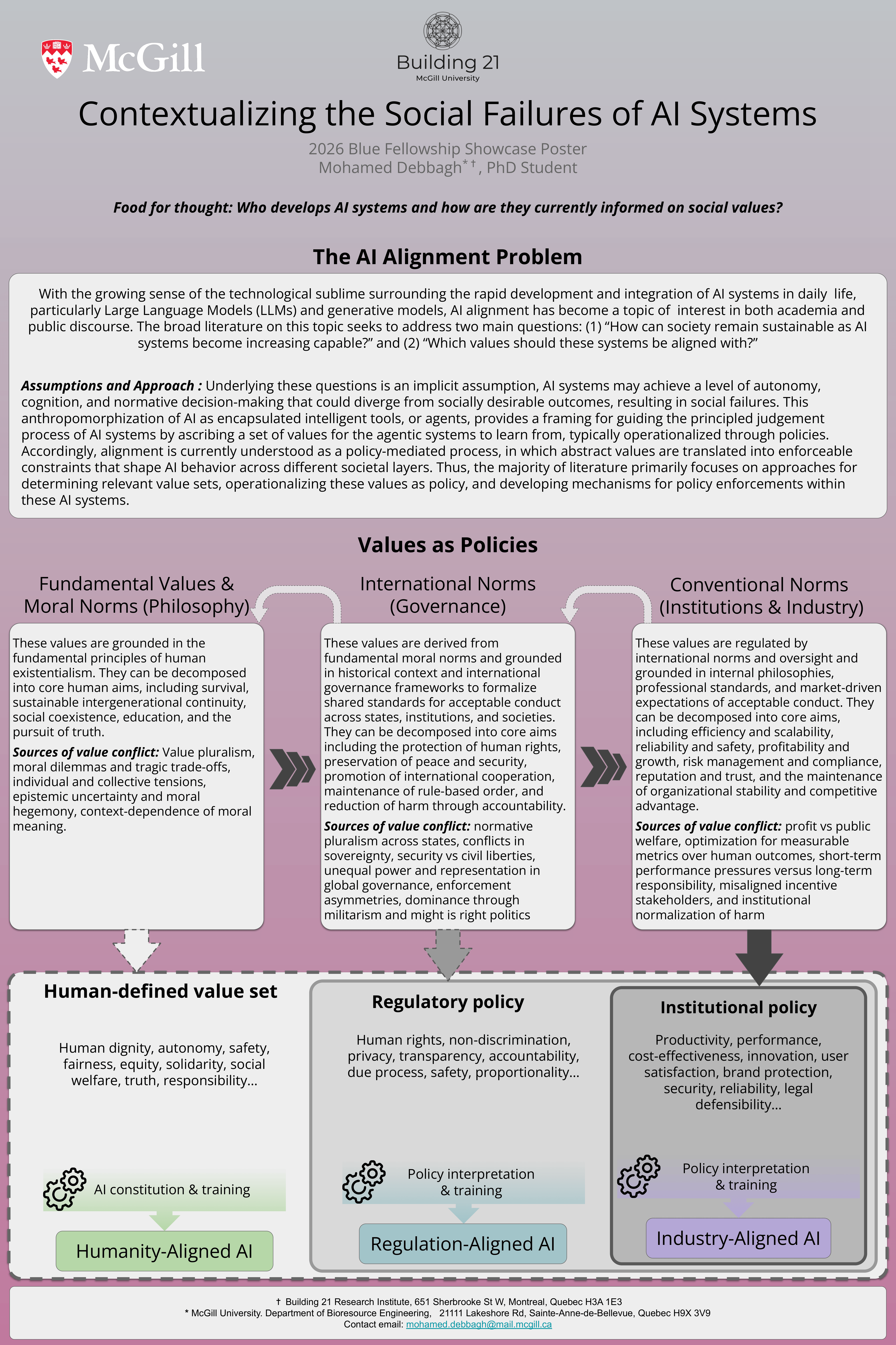 Poster 2 provides a look into how social failures are contextualized in current systems through the AI alignment problem, its formulation through value systems as policies and the operationalization of those policies into AI systems. It is based on various academic literature in the field of AI alignment, as well as personal attendence of AI policy conferences, and individual discussion had with technical developers of AI systems in industry that embed institutional policy enforcement into their AI systems.